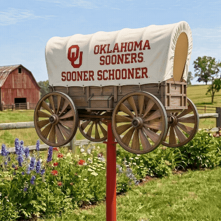 ❤️This stunning wind-powered sculpture faithfully recreates the famous Sooner Schooner covered wagon, complete with crisp white canvas top proudly displaying the bold red “OKLAHOMA SOONERS” lettering, the classic “SOONER SCHOONER” script, and the iconic crimson “OU” logo that fans cheer every game day.